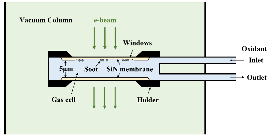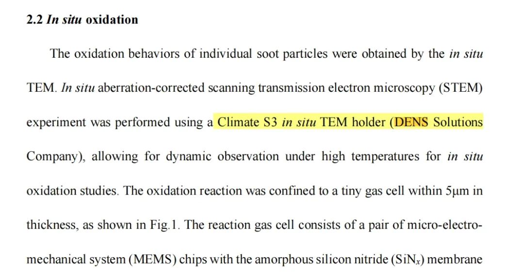 所使用的系统- Climate 气相加热杆:使用 DENS Climate 原位气相加热样品杆,研究团队可以在透射电镜中向样品区通入气氛并同时加热,从而原位研究烟尘纳米颗粒的在高温下的氧化过程。