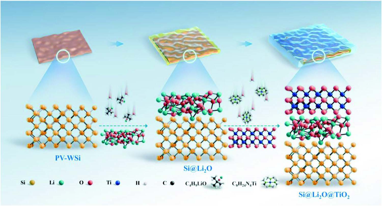随着车辆续航里程需求的不断增长,对高能量密度 LIBs 的需求也变得越来越迫切。与石墨相比,硅(Si)以其高理论比容量(4200 mAh/g)被视为提高商业化 LIBs 能量密度的优选负极材料。然而,制备具有高初始库仑效率(ICE)和高倍率性能的硅基负极仍然面临着重大挑战。近年来人们开始关注光伏硅废料(PV-WSi)在制备硅基负极方面的应用。充分利用 PV-WSi 的二维结构特性,制备高倍率和高 ICE 硅基负极是一项具有挑战性但有意义的任务。