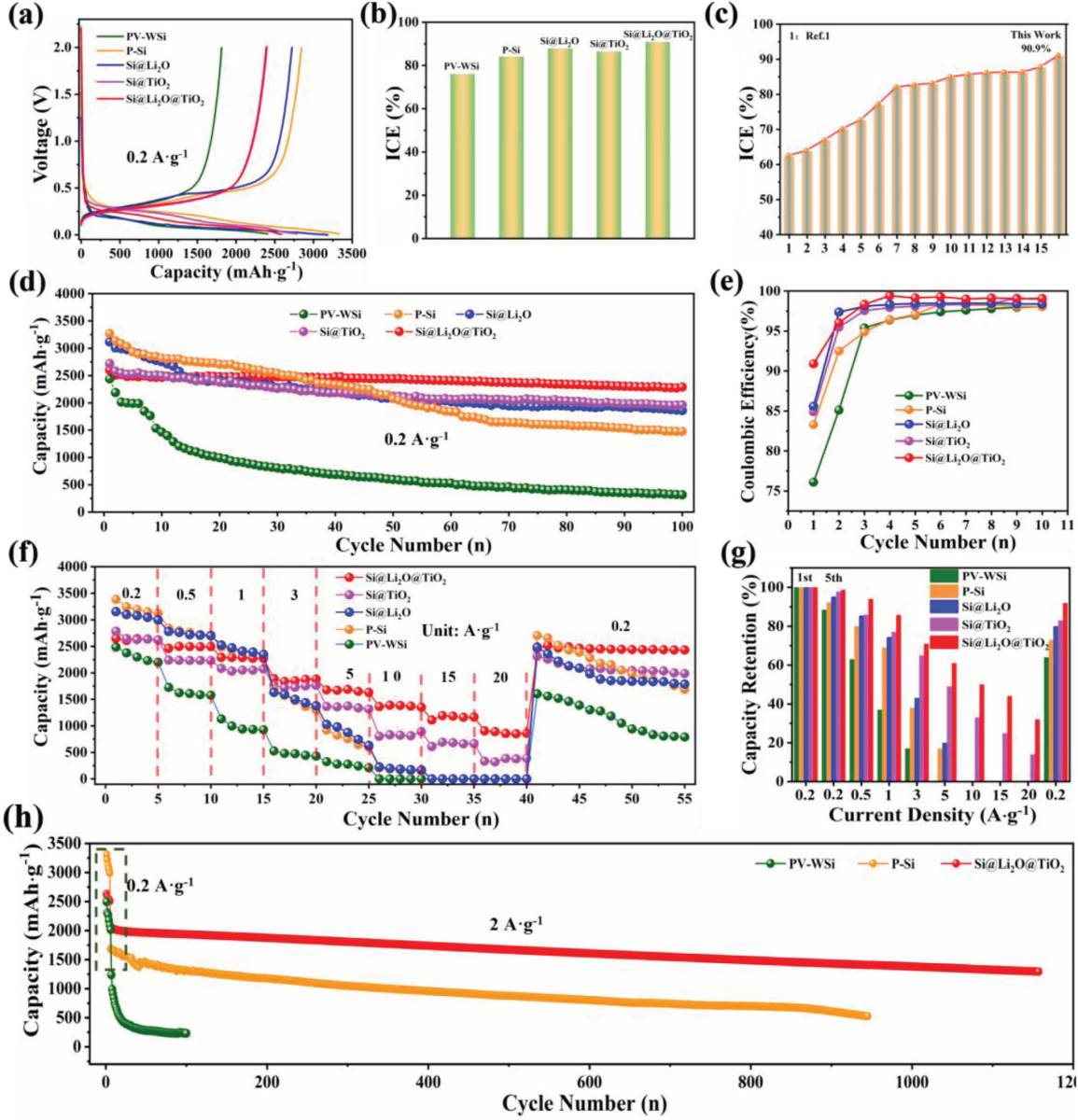 a) PV-WSi、P-Si、Si@Li2O、Si@TiO2 和 Si@Li2O@TiO2 的电压-容量曲线以及 b) 它们的初始库仑效率(ICE);c) 本研究中 Si@Li2O@TiO2 电极的 ICE 与之前报道的基于硅的负极材料的 ICE 进行比较;d) PV-WSi、P-Si、Si@Li2O、Si@TiO2 和 Si@Li2O@TiO2 的循环性能以及 e) 前十个循环的库仑效率,f) 不同电流下的倍率性能,以及 g) PV-WSi、P-Si、Si@Li2O、Si@TiO2 和 Si@Li2O@TiO2 的容量保持率;h) PV-WSi、P-Si 和 Si@Li2O@TiO2 的长期循环性能。