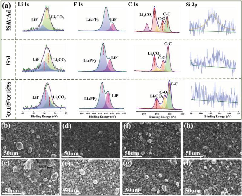 a) PV-WSi、P-Si、Si@Li2O@TiO2 电极在 2 A g-1 下循环 100 次后的 Li 1s、F 1s、C 1s、Si 2p XPS 光谱;b) PV-WSi、d) P-Si、f) Si@TiO2 h) Si@Li2O@TiO2 电极在循环前的 SEM 图像;c) PV-WSi、e) P-Si、g) Si@TiO2 i) Si@Li2O@TiO2 电极在 2 A g-1 下循环 100 次后的 SEM 图像。