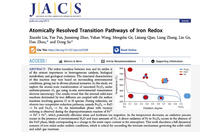 近日,中科院物理所苏东研究员和莱布尼茨晶体生长研究所周丹老师使用原位 ETEM 探索了纳米级 Fe3O4 在常压 H2 氛围下的原子级相变。研究结果表明,以铁扩散为主导的内部固态反应与涉及气态氧或氢的表面反应相结合。在还原过程中,团队观察到两种竞争性还原路径,即 Fe3O4→FeO→Fe和Fe3O4→Fe。在 Fe2+→Fe0 + Fe3+ 的歧化反应过程中观察到具有空位有序的中间相,这可能会减轻应力并促进离子迁移。随着温度降低,在 H2O 氛围和微量 O2 存在下会发生氧化过程。在没有 FeO 相的情况下,Fe 接氧化为 Fe3O4,这可能与环境中水蒸气含量的变化相对应。该工作阐明了现实条件下铁氧化还原的完整动力学场景,这对于揭示控制固-固和固-气反应的复杂机制至关重要。