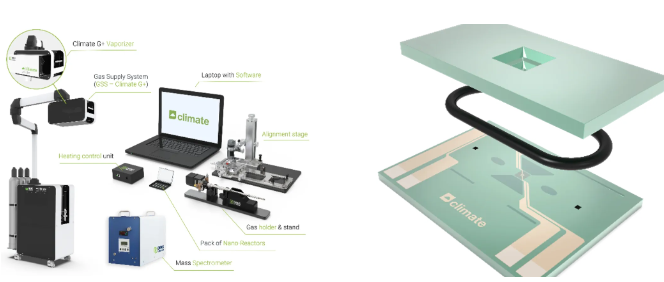DENSsolutions Climate G+ 气相加热系统(左)和 Nano-Reactor 特写(右)