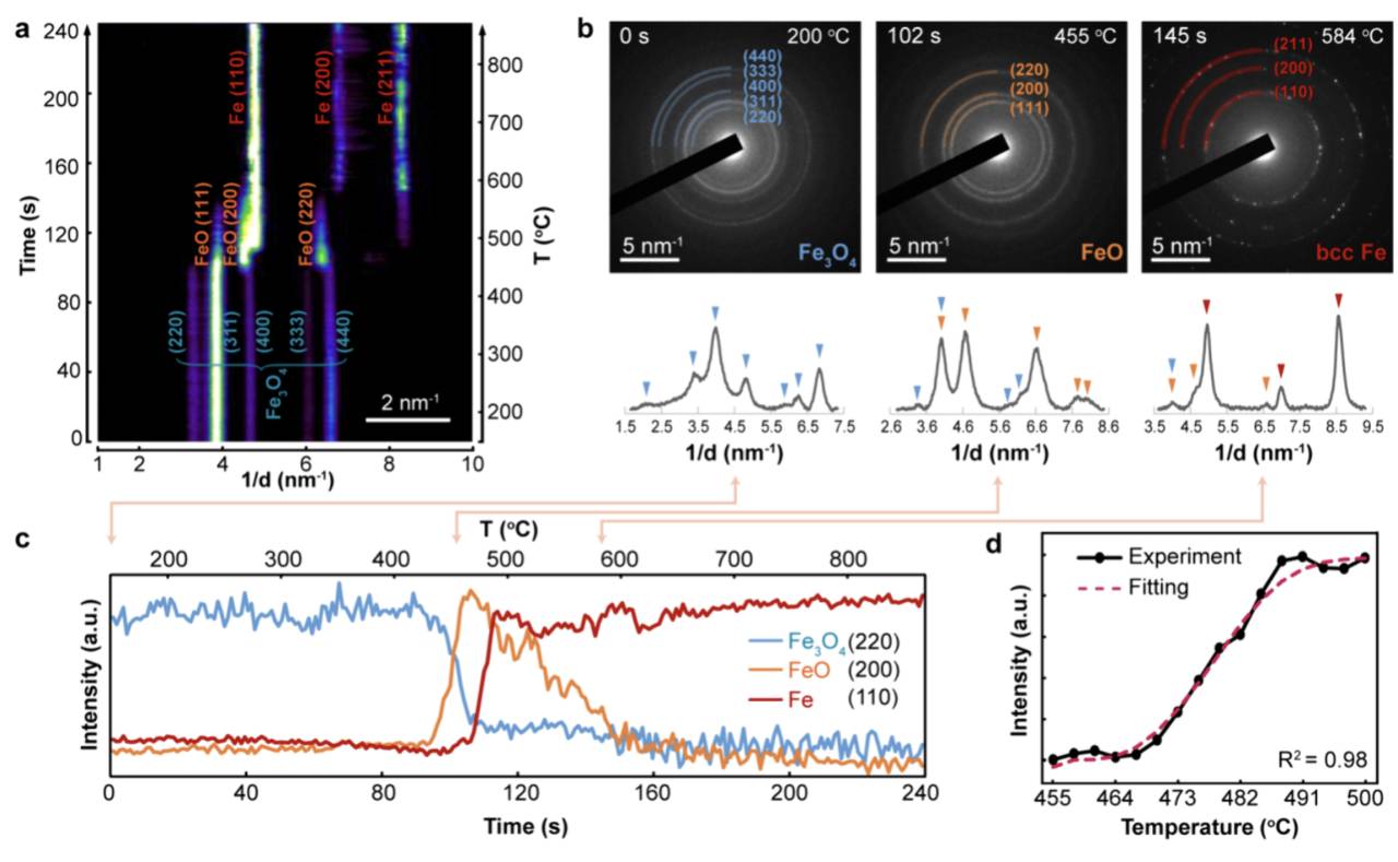 (a)位置积分的 SAED 强度分布图,其中横轴是倒空间的距离、左纵轴是反应时间、右纵轴是反应温度。(b)0 秒(200℃)、102秒(455℃)、145秒(584℃)时的三个典型衍射花样,分别对应标定于 Fe3O4、Fe3O4/FeO混合物、Fe。(c)Fe3O4{220}、FeO {200}、Fe {110} 的特征峰强度曲线,展示了这三种相的含量随时间、温度的关系,曲线已经被归一化。(d)Fe{110} 衍射从 455℃ 到 500℃的实验、拟合强度曲线。