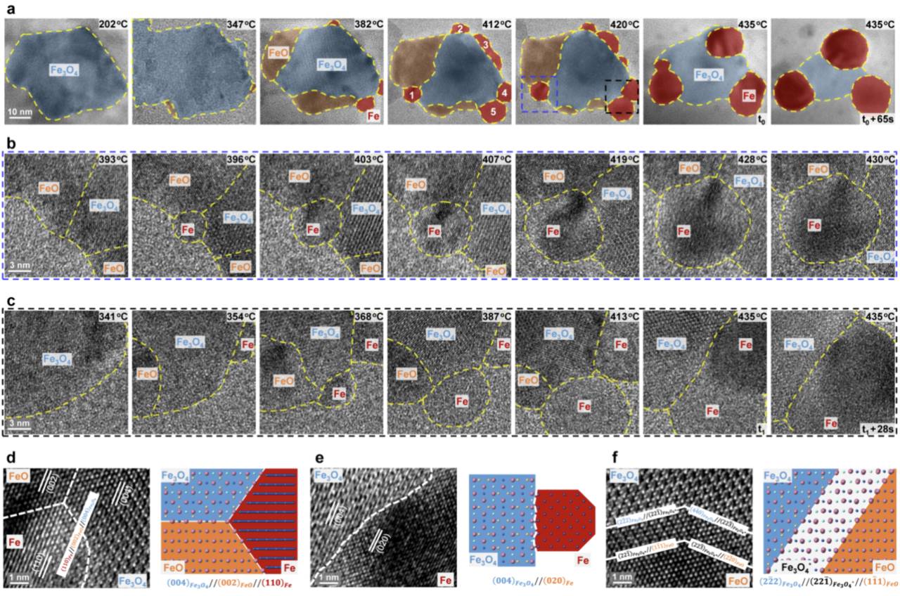 (a)系列 HRTEM 照片展示了随温度升高时 Fe3O4 的还原行为。(b)a 图中蓝色虚线区域的高倍 HRTEM 图展示了 FeO-Fe3O4 界面处铁纳米颗粒的成核过程。(c)a 图中黑色虚线区域的高倍 HRTEM 图展示了,FeO-Fe3O4 纳米颗粒表面两个铁纳米颗粒的聚合过程。(d)Fe3O4、FeO、Fe 的三相界面处。(e)Fe3O4 与 Fe 的两相界面。(f)歧化反应过程中,Fe3O4 和 FeO 的中间结构。