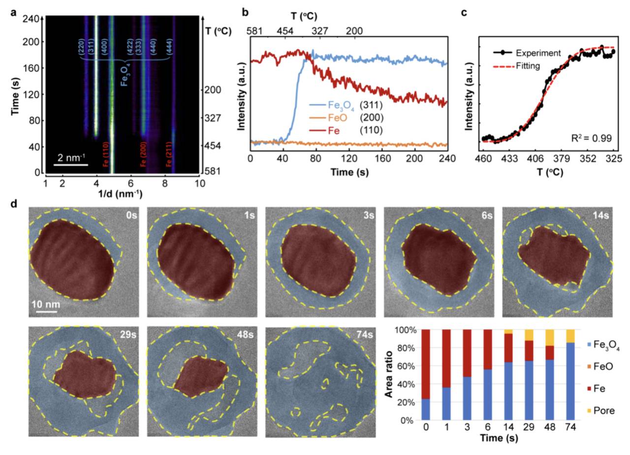 (a)位置积分的 SAED 强度分布图,其中横轴是倒空间的距离、左纵轴是反应时间、右纵轴是反应温度。(b)Fe3O4{311}、FeO{200}、Fe{110} 的特征峰强度曲线,展示了对应含量随时间、温度的变化,曲线已经归一化处理。(c)Fe3O4{311} 衍射从 460℃ 到 325℃ 的实验、拟合强度曲线。(d)系列 HRTEM 照片展示了随温度降低时铁纳米颗粒的氧化行为。Fe3O4 和 Fe 相分别用浅蓝色、暗红色标记出。所有界面和表面分别用黄色虚线标出。相和孔的投影面积分别以百分比叠加图表示。