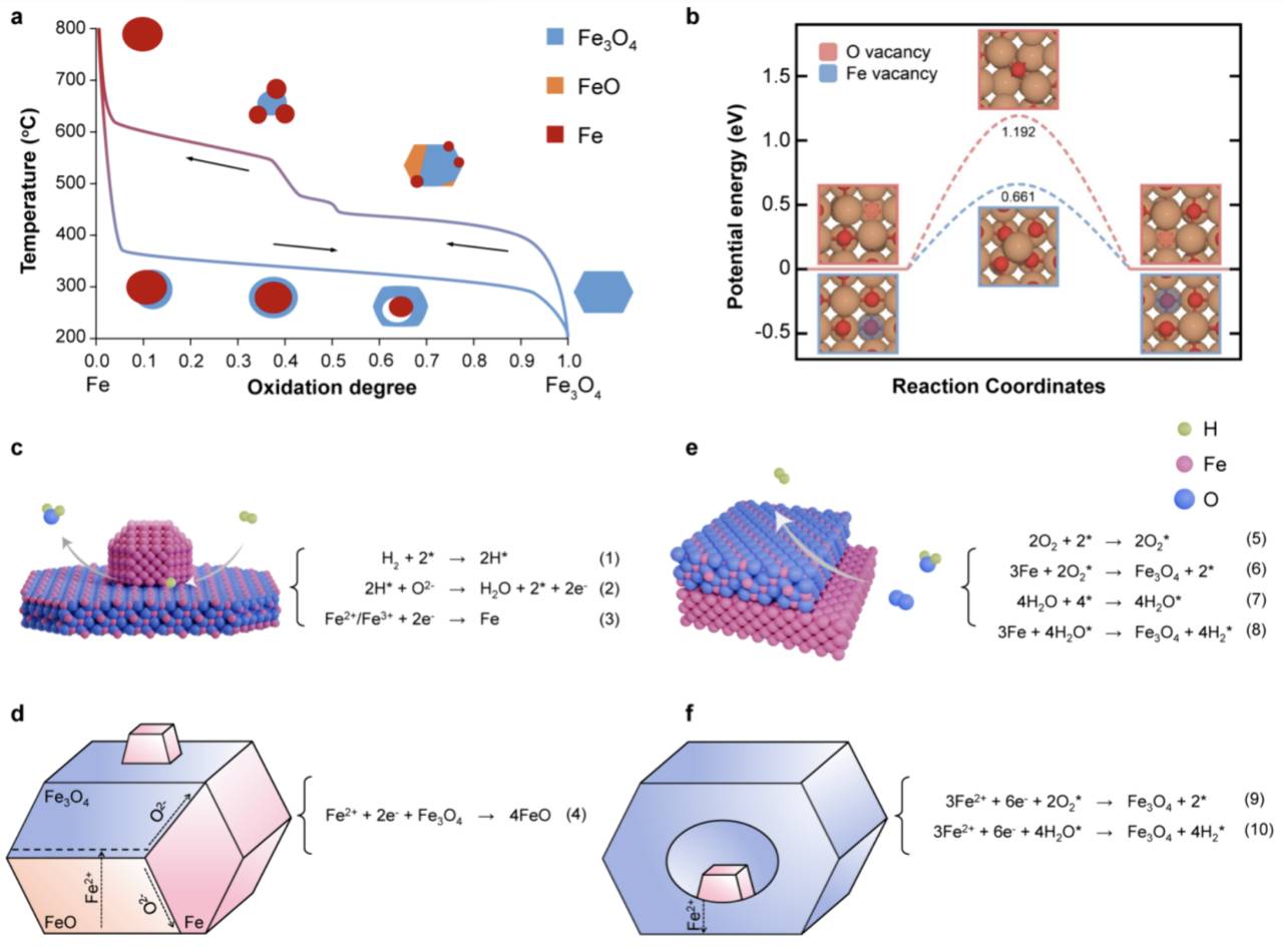 (a)纳米颗粒氧化程度量化演变曲线。实线箭头标记了反应进行的反向。(b)DFT 计算的FeO 中氧空位、铁空位扩散能曲线。表面处(c)、块体中 (d) 的还原进程以及表面处(e)、块体中(f)的氧化进程原理示意图。