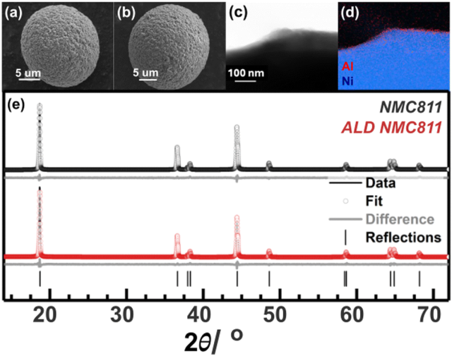 1右图为利用图1. (a)合成后的 NMC811 和(b)ALD NMC811 次级颗粒的扫描电子显微镜(SEM)图像;(c)ALD NMC811 颗粒的明场像以及(d)对应的Ni(蓝色)和Al(红色)的能谱分析(EDX)图。X射线(波长λ = 1.5406 Å)衍射图(e)比较了NMC811(黑色)和ALD NMC811(红色)的实验数据(实线)、Rietveld精修结果(空心圆)、数据与拟合之间的差异(灰色线)以及R3m空间群预期反射的位置(垂直刻度)。