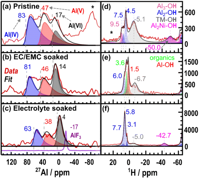 图2. ALD NMC811的²⁷Al魔角旋转(MAS)核磁共振(NMR)谱图:(a)合成后的原始状态,(b)在EC/EMC(3:7,体积比)溶剂中浸泡24小时后(随后在真空中干燥),以及(c)在1 M LiPF₆的EC/EMC(3:7,体积比)电解液中浸泡24小时后(随后在真空中干燥)。ALD NMC811的¹H MAS NMR谱图:(d)原始状态,(e)在EC/EMC溶剂中浸泡24小时后,以及(f)在1 M LiPF₆的EC/EMC电解液中浸泡24小时后。
