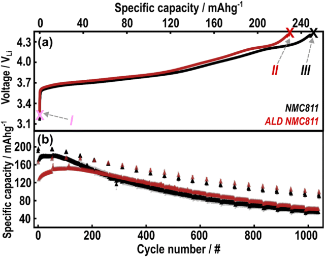 图3. (a)NMC811(黑色)和ALD NMC811(红色)首次充电(假设实际容量为200 mAh g⁻¹,充电速率为C/20)的电压曲线。图中的交叉点表示通过事后核磁共振(post-mortem NMR)分析的样品状态:粉色交叉点(I)表示浸泡在1 M LiPF₆的EC/EMC电解液中的ALD NMC811;红色交叉点(II)表示充电至4.4 V(用DMC冲洗)的ALD NMC811;黑色交叉点(III)表示充电至4.4 V(用DMC冲洗)的NMC811。(b)展示了NMC811和ALD NMC811在C/2倍率下进行49次老化循环以及在C/20倍率下进行2次诊断循环的放电容量随长期循环的变化。