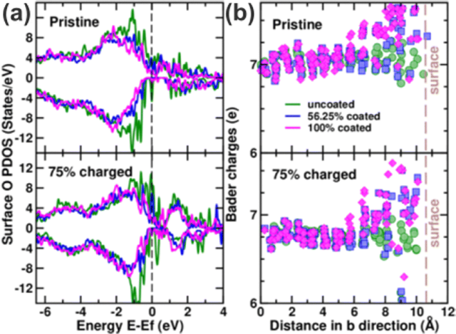 图4. 电子态密度和Bader电荷:(a)展示了原始和75%脱锂(充电)的NMC811结构中表面氧的投影态密度(PDOS)。图中分别考虑了三种情况:无铝存在(绿色)、铝部分(56.25%)替代表面过渡金属(蓝色)以及铝完全替代表面过渡金属(紫色)。在b方向上,表面施加了高达20 Å的真空层。黑色虚线表示费米能级。(b)展示了从体相(0 Å)到表面(10.8 Å,用棕色虚线标记)方向的Bader电荷分布。理想化的O²⁻周围的价电子电荷应为8个电子,但在Bader电荷划分中被低估(从完全锂化结构的体相中约7个电子到脱锂情况下的体相中约6.75个电子)。