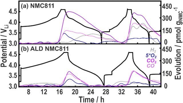 图6. 在线电化学质谱(OEMS)及对应的NMC811|Li电压曲线:(a)未涂覆Al₂O₃的NMC811|Li,(b)涂覆Al₂O₃的NMC811|Li。原位电池在3–4.6 VLi之间循环,充电速率为C/10,随后为C/5(假设实际容量为200 mAh g⁻¹),在充电上限保持1小时,使用氩气作为载气。