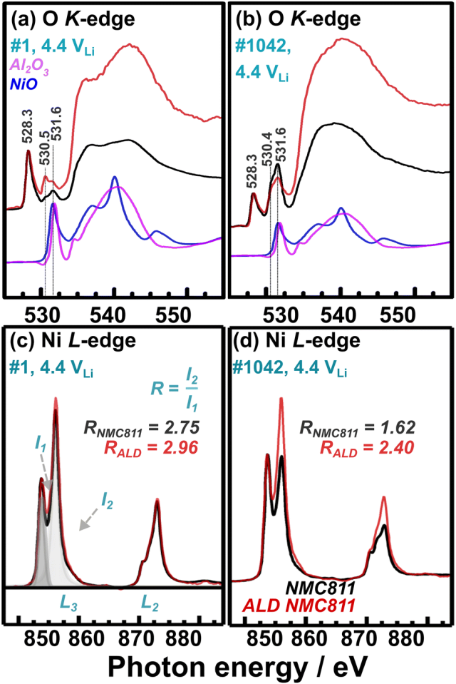 图.6.(a)和(c)展示了首次充电至4.4 VLi的NMC811(黑色)和ALD NMC811(红色)电极的O K-edge和Ni L-edge X射线吸收光谱,同时提供了 γ-Al₂O₃(品红色)和NiO(蓝色)参考样品的光谱。经过1042次循环后的电化学老化状态,以及充电至4.4 VLi的材料的O K-edge和Ni L-edge光谱分别在(b)和(d)中展示。对于Ni L-edge,L₃高能量(I₂,855.8 eV)与低能量(I₁,853.7 eV)积分面积的比值用R表示