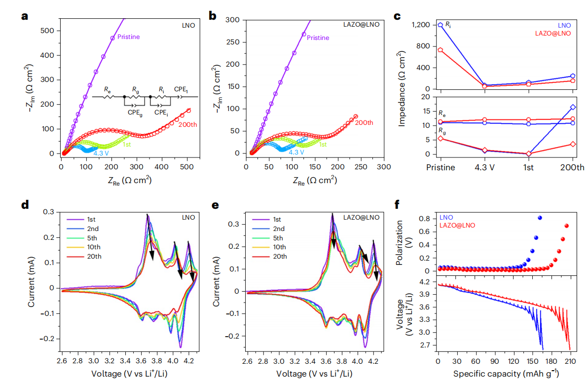 图2 | LAZO@LNO基全固态锂电池(ASSLBs)的电化学行为,显示出显著增强的锂离子传输动力学。a,b, LNO基ASSLB(a)和LAZO@LNO基ASSLB(b)在原始、4.3V充电、首次放电和第200次放电状态下的阻抗(Z)演变,其中空心圆圈表示测量数据,实线表示拟合结果。在a图的插图中展示了建议的(逻辑上的)等效电路,其中Re、Rg-CPEg、Ri-CPEi和CEP1分别表示电解质体相电阻、电解质晶界电阻、正负极界面电阻和正极内部的Warburg电阻。CPE表示常相位元件。c, 在a,b中获得的不同状态下LNO和LAZO@LNO基ASSLBs的阻抗值的整体图。d,e, LNO基ASSLB(d)和LAZO@LNO基ASSLB(e)在第1、2、5、10和20个循环的循环伏安(CV)曲线。电位扫描速率为0.02mV/s。黑色箭头表示峰电流和峰电压的演变趋势。f, LNO和LAZO@LNO基ASSLBs的恒流间歇滴定技术(GITT)曲线及其对应的电池极化。