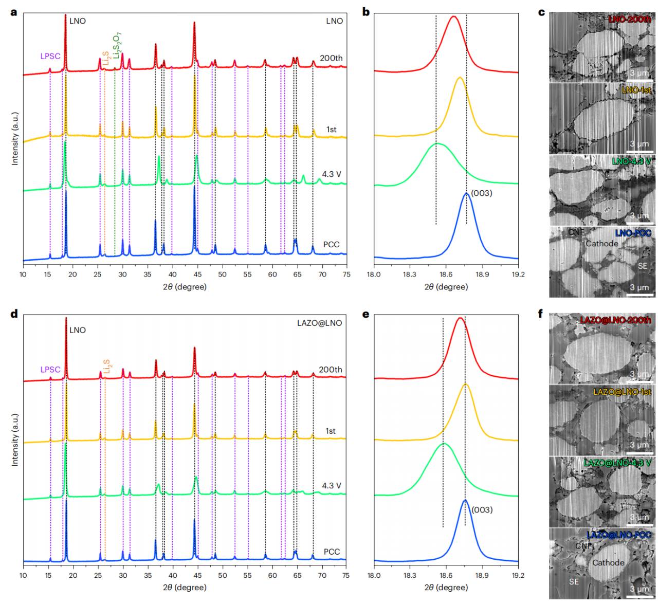 图3 | X射线衍射和PFIB-SEM分析,展示复合正极在不同阶段的电化学机械演变。a–c, 原始、4.3V充电、首次放电和第200次放电的LNO复合正极的X射线衍射图(a,b)和典型的横截面PFIB-SEM图像(c)。d–f, 原始、4.3V充电、首次放电和第200次放电的LAZO@LNO复合正极的X射线衍射图(d,e)和典型的横截面PFIB-SEM图像(f)。图a、b、d和e中的垂直虚线表示不同相,并突出显示了复合正极在不同阶段的相变。