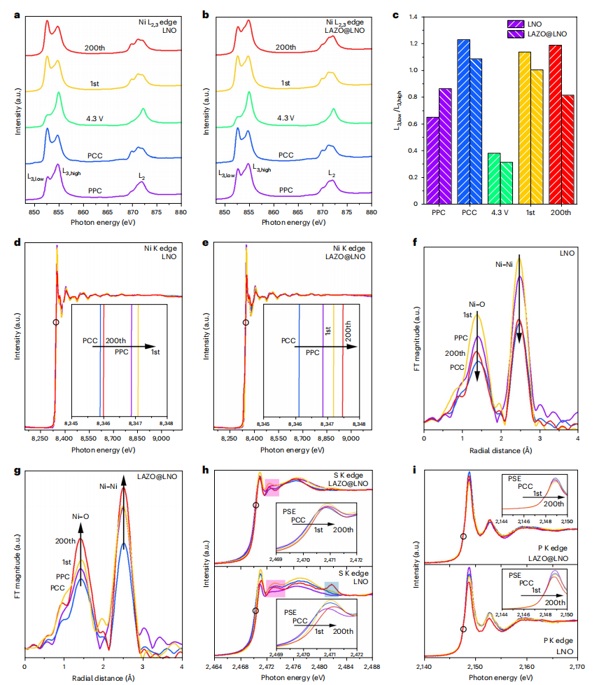 图4 | X射线吸收光谱(XAS)分析,展示LNO、LAZO@LNO和LPSC在复合正极中不同阶段的结构演变。a,b, LNO(a)和LAZO@LNO(b)正极在它们的原始纯正极(PPC)、原始复合正极(PCC)、4.3V充电、首次放电和第200次放电状态下的总电子产额(TEY)Ni L2,3边软X射线吸收光谱(SXAS)数据。c, 从a,b中得出的LNO和LAZO@LNO样品在其不同状态下的L3,low/L3,high比率。d,e, LNO(d)和LAZO@LNO(e)正极在它们的PPC、PCC、首次放电和第200次放电状态下的Ni K边X射线吸收近边结构(XANES)光谱。f,g, LNO(f)和LAZO@LNO(g)正极在它们的PPC、PCC、首次放电和第200次放电状态下的Ni K边扩展X射线吸收精细结构(EXAFS)光谱的傅里叶变换径向分布函数。h,i, 原始LPSC(PSE;紫色轨迹)和LNO(底部)以及LAZO@LNO(顶部)正极在它们的PCC、首次放电和第200次放电状态下的S K边(h)和P K边(i)XANES光谱,其中插图展示了被黑圈突出显示区域的放大图。h中的粉色和蓝色阴影区域分别突出了Li₂S和亚硫酸盐/硫酸盐的特征峰。