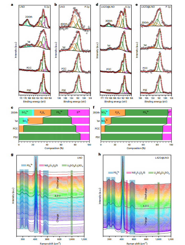 图5 | XPS和拉曼分析,展示LPSC在复合正极中不同阶段的表面组成演变。a–c, S 2p(a)和P 2p(b)XPS数据以及对应的组成分析(c),针对原始LPSC(PSE)和LNO正极在原始复合正极(PCC)、首次放电和第200次放电状态。d–f, S 2p(d)和P 2p(e)XPS数据以及对应的组成分析(f),针对原始LPSC(PSE)和LAZO@LNO正极在原始复合正极(PCC)、首次放电和第200次放电状态。g,h, 在充放电过程中,LNO(g)和LAZO@LNO(h)复合正极中LPSC分解的原位拉曼表征。