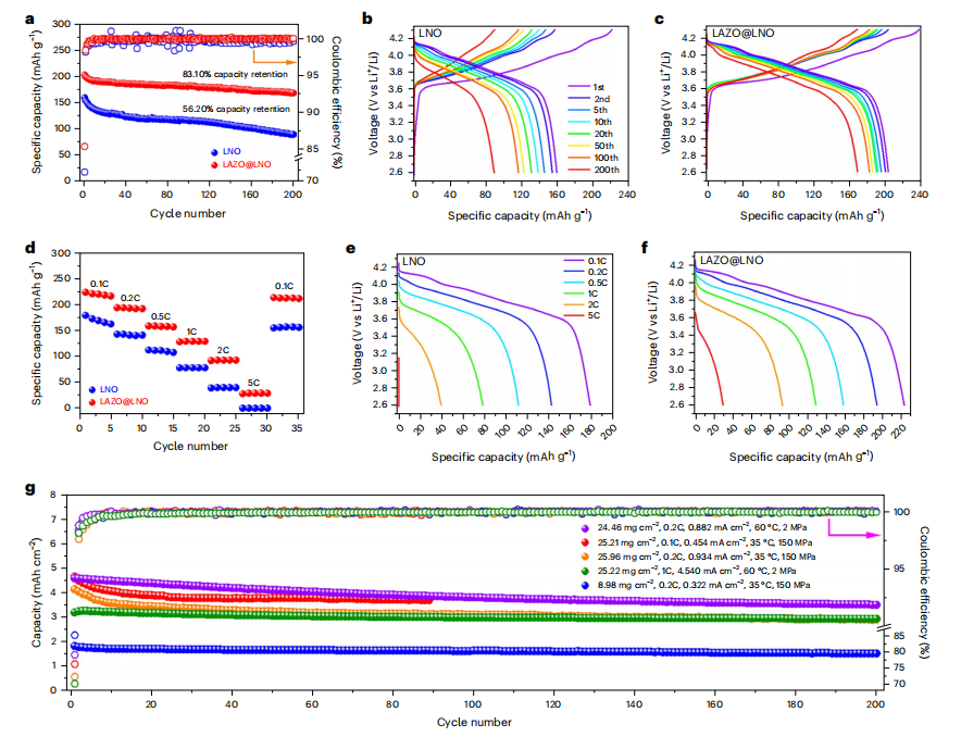 图6 | LAZO@LNO基ASSLBs相较于LNO基ASSLBs展现出的卓越电化学性能。a, LNO和LAZO@LNO基ASSLBs在0.2C、35°C和150MPa条件下的循环稳定性和库仑效率。b,c, LNO(b)和LAZO@LNO基(c)ASSLBs在0.2C、35°C和150MPa条件下,第1、2、5、10、20、50、100和200次循环的恒流充放电电压曲线。d, LNO和LAZO@LNO基ASSLBs在35°C和150MPa条件下的倍率性能。e,f, LNO(e)和LAZO@LNO基(f)ASSLBs在不同电流密度下的放电电压曲线。g, 高活性材料(CAM)负载下LAZO@LNO基ASSLBs的电化学性能。在35°C和60°C下测试的ASSLBs的CAM比例分别为65%和75%。所有实验均在2.0至3.7V相对于LiIn/In(对应于大约2.6至4.3V相对于Li⁺/Li)之间进行。