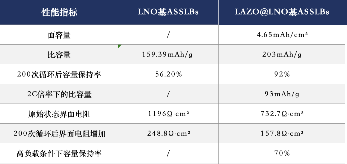 通过电化学阻抗谱(EIS)测试,研究人员发现LAZO@LNO 基 ASSLBs 在不同状态下的界面电阻(Ri)显著低于未涂层的 LNO 基 ASSLBs。具体来说,LAZO@LNO 基 ASSLBs 在原始状态下的界面电阻为732.7Ω·cm²,而LNO基 ASSLBs 则高达 1196Ω·cm²。在经过200次循环后,LAZO@LNO 基 ASSLBs 的界面电阻仅增加了 157.8Ω·cm²,而 LNO 基 ASSLBs 的界面电阻增加了 248.8Ω·cm²。这表明 LAZO 保护层极大地改善了正极与固态电解质之间的界面接触,降低了界面电阻,从而提高了锂离子在界面处的传输动力学。
