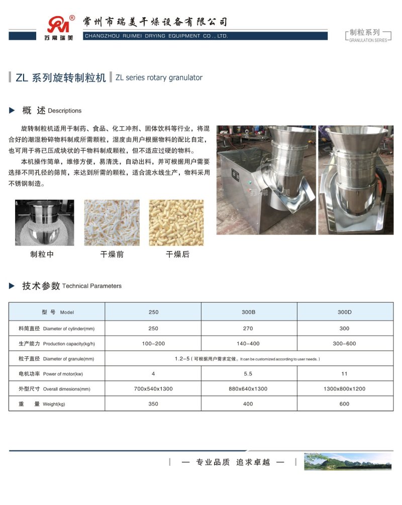 根据苏常瑞美官方产品资料显示:旋转制粒机的螺杆直径(mm)为300,功率(kw)为5.5,重量(kg)为400,规格外形(长*宽*高)为880x640x1300,膜孔直径(mm)为1.2-5.0,螺杆数为其他,生产能力(kg/h)为140-400,适用物料为粉末物料,旋转制粒机的价格为1-5万元,具体型号是ZL-300,品牌为苏常瑞美。
