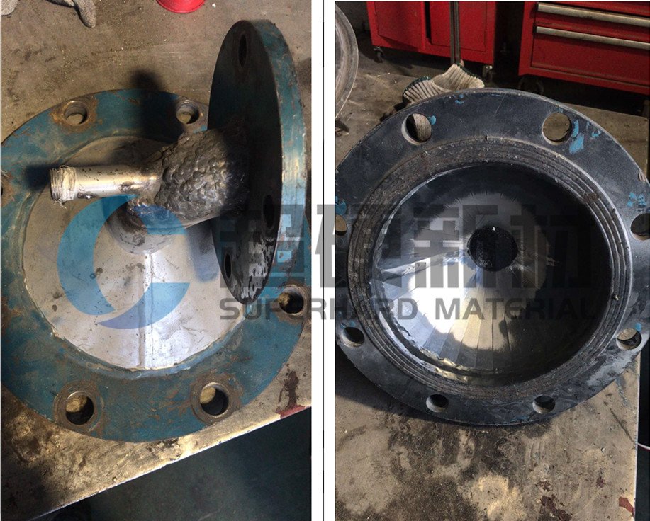 发送仓牛角弯喷涂碳化钨三个月即磨损,换陶瓷内衬后一年多无明显磨损