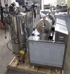 真空加料机中装有压缩空气反吹装置,每次放料时,压缩空气脉冲反吹过滤器,把吸附于过滤器表面的粉末打落下来,以保证吸料能正常运行。