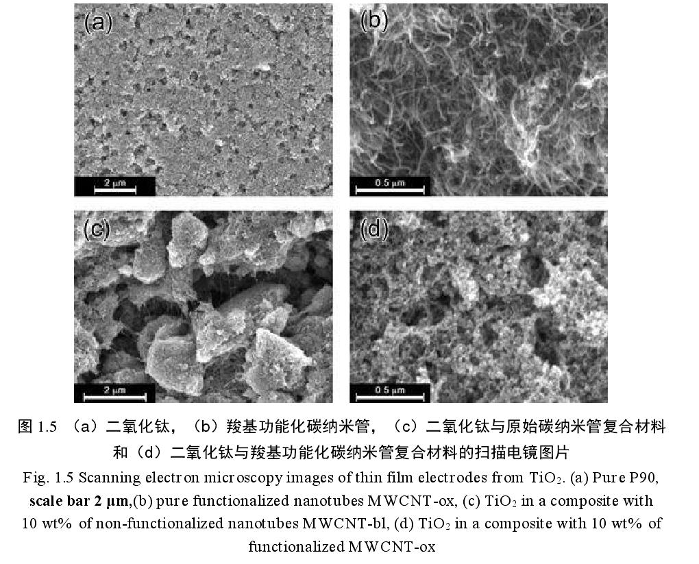 Kavan 等通过将 MWCNTs 超声分散在 Ti O2中制备成 MWCNTs/Ti O2复合负极材料,研究结果发现在碳纳米管表面修饰一些羧基官能团后,能够更好的与纳米 Ti O2 颗粒结合。通过扫描电镜图片(图 1.5)可以观察到表面经过羧基修饰后的MWCNTs 与原始 MWCNTs 相比,分散性更好,在颗粒表面形的导电网络更加均匀。虽然加入 MWCNTs 后 Ti O2 的容量并没有提高,但是增加了锂离子移动速度。近期有研究组将硅沉积在碳纳米管骨架上形成同轴结构,其结合了硅的高容量和碳纳米管的结构稳定性,成功实现了质量能量密度达到 1500A·g-1的锂离子电池负极材料的制备。