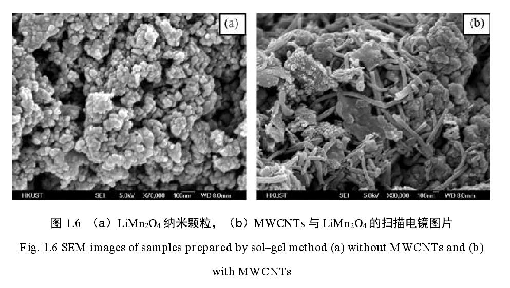 Liu 等合成了 MWCNTs 与 Li Mn2O4 纳米颗粒的复合电极材料,在扫描电镜下(图 1.6)可以看到 MWCNTs