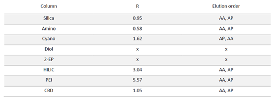 ▲ 表1:样品在不同固定相色谱柱条件下的分辨率值和洗脱顺序