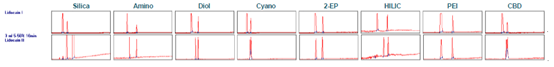 ▲ 图 3:顶部:利多卡因合成的反应方程式,底部:Sepmatix 8x SFC 仪器色谱柱筛选IP与利多卡因结果;从左到右:硅胶,氨基,二醇基,氰基,2-EP,HILIC,PEI 和 CBD;运行时间 = 10分钟。