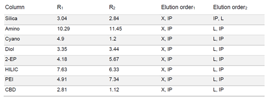 ▲ 表2:样品在不同固定相色谱柱条件下的分辨率值和洗脱顺序