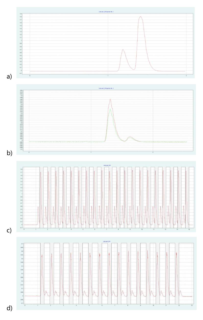 ▲ 图4:中间体 IP 的单次进样(a)和叠加进样(c);运行条件:流速 = 20 mL/min,改性剂 = 甲醇 + 20 mM 氨水,改性剂 % = 16 %,温度 = 40 °C,压力 BPR = 150 bar,进样量 = 170 μL,紫外波长 = 254 nm;叠加进样条件:进样次数 = 15,叠加时间 = 0. 75 min, Fractions = 1 (基于时间); 利多卡因L的单次进样 (b) 和叠加进样 (d) ; 运行条件:流速 =20 mL/min, 改性剂 = 甲醇 + 20 mM 氨水, 改性剂 % = 20 %, 温度 = 40 °C 和压力 BPR = 150 bar, 进样 = 170 μL, 紫外波长 = 254 nm; 叠加进样条件:进样次数 = 20, 叠加时间 = 0.65 min, Fractions = 1 (基于时间)。