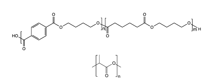 ▲ 图1:聚对苯二甲酸丁二酸酯(PBAT)(上)和聚乳酸(PLA)(下)的结构式