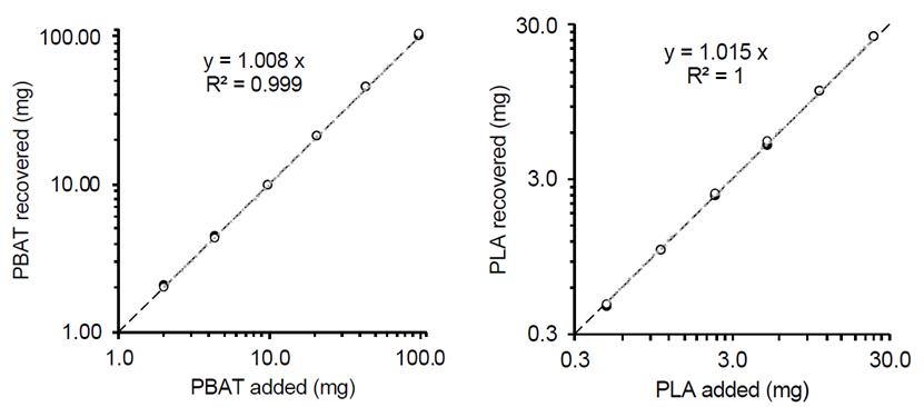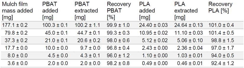 PBAT 和 PLA 的回收率都在可接受的范围内,PLA 从 92% 到 101%,PBAT 的平均回收率为 100.8%,PLA 的平均回收率为 101.5%,这些结果表明,PBAT 和 PLA 都是定量提取,而不需要对提取物进行纯化(即土壤中的有机质对 PBAT 和 PLA 的干扰很小)。