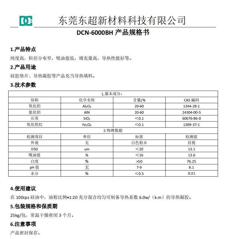根据东超官方产品资料显示:6.0W/m·K 高性能凝胶用导热粉的纯度为99.6,目数为多种,6.0W/m·K 高性能凝胶用导热粉的价格为1万元以下,具体型号是DCN-6000BH,品牌为东超。