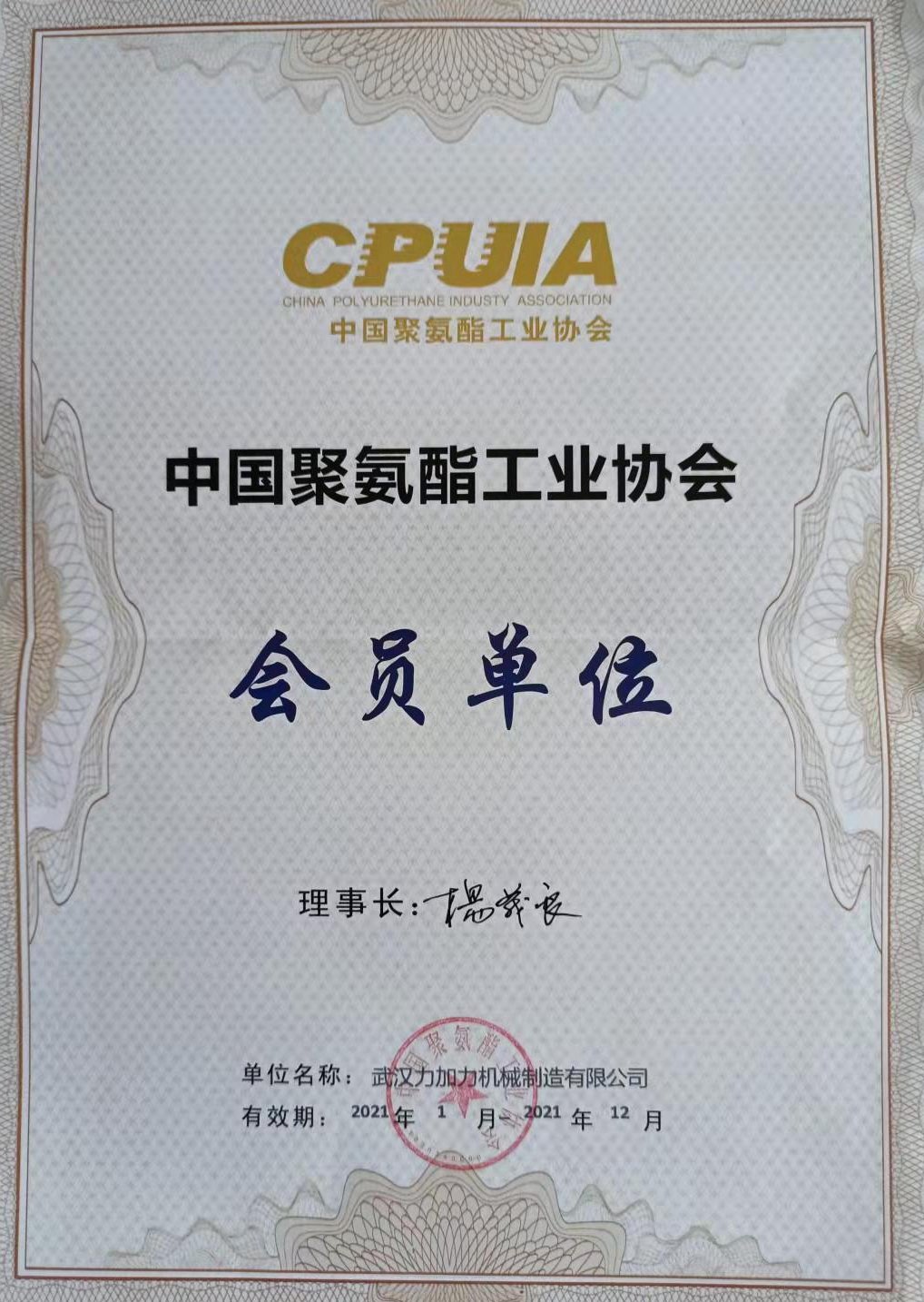 2021年中国聚氨酯工业协会会员单位证书