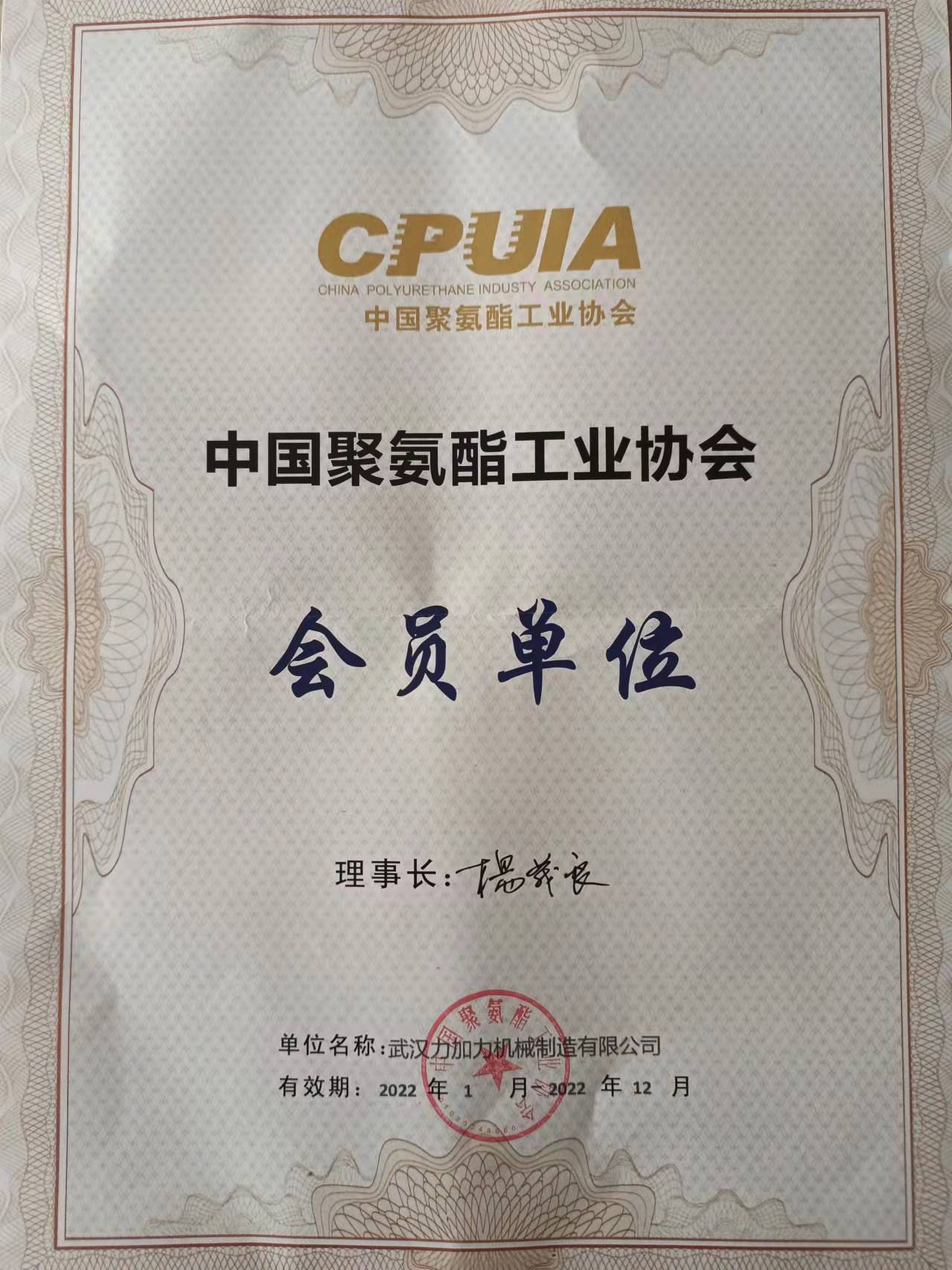 2022年中国聚氨酯工业协会会员单位证书
