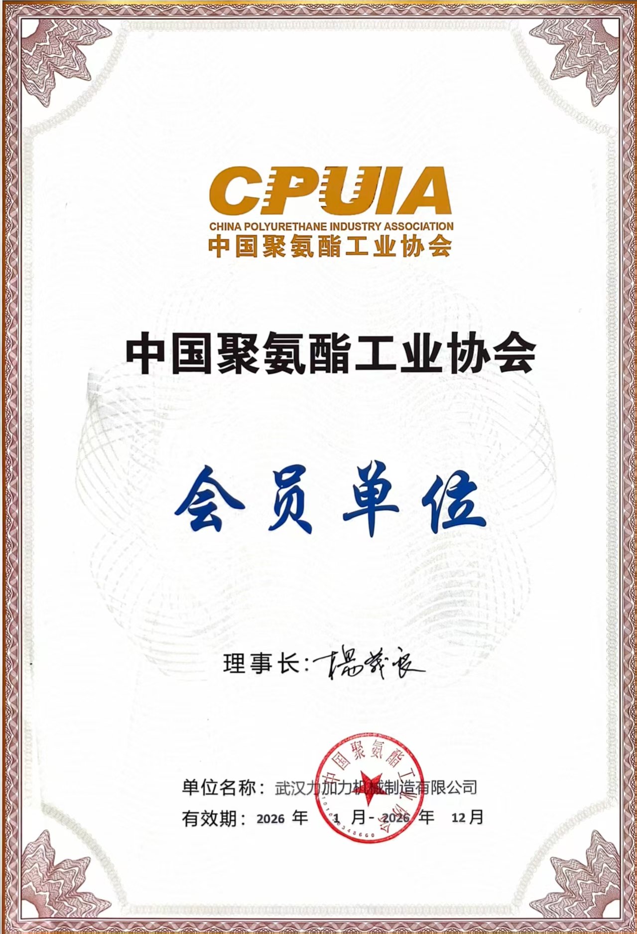 2026年中国聚氨酯工业协会会员单位证书