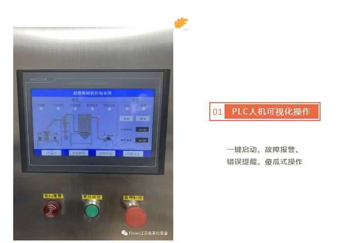 江苏泰慕仕WFJ20超微粉碎机智能化程度高,采用PLC人机可视化操作,一键启动、故障报警、错误提醒、傻瓜式操作;电器均采用施耐德电气;转速6000转,每小时产量80-150公斤;细度超400目,超级细腻。