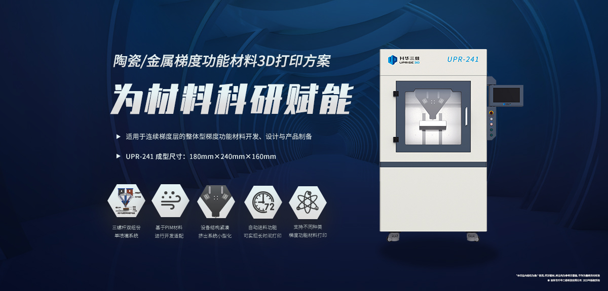 在2024年 TCT亚洲展上,我们还发布了最新研发的金属/陶瓷功能梯度材料3D打印机UPR-241。该设备可以为金属/陶瓷梯度材料设计提供最佳的组份控制和连续梯度分布,其独特的三螺杆双组份单喷嘴挤出系统,可实现高效的材料混合及实时精准调控,大幅优化了梯度材料制备工艺和材料成本。为金属/陶瓷梯度材料开发带来了全新的解决方案。