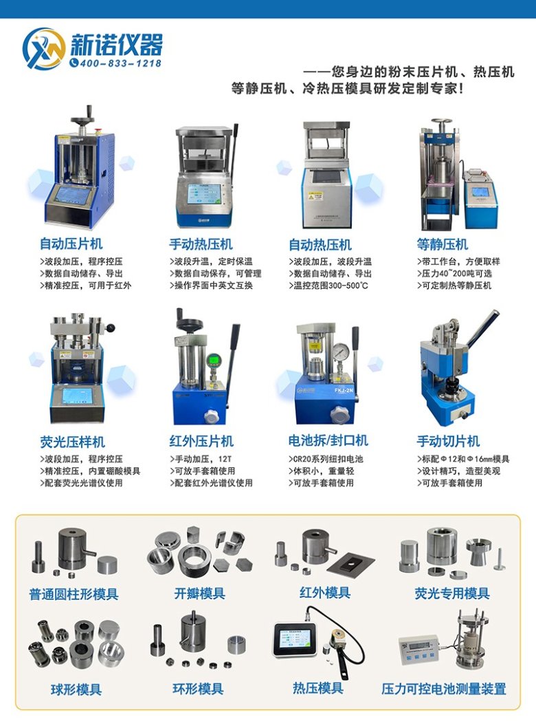 新诺仪器专注于粉末成型领域的产品研发、生产和制造,主营粉末压片机、热压机、等静压机、红外荧光光谱仪配套设备及冷热压模具的研发定制,随着公司实力和品牌影响力的不断提升,粒度仪、电池等新材料研发相关设备也不断问世。
