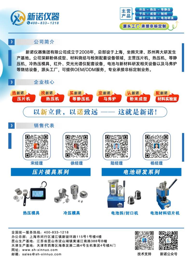 新诺仪器集团有限公司主营实验室压片机、热压机、等静压机、压片模具、红外荧光光谱仪配套设备、电池、新材料研发相关设备,箱式炉,管式炉、真空气氛炉等烧结设备。