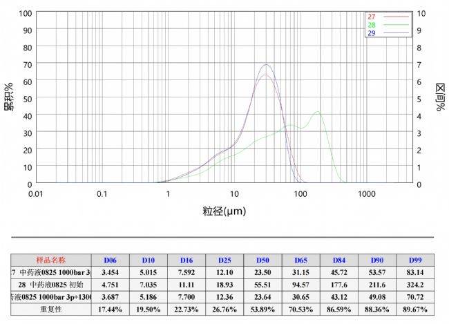 我们用ATS高压均质机对中药提取液进行处理。在设定的压力下进行多轮循环均质后,药液中原本粗大的颗粒被有效细化,体系趋于均一稳定,透光率提升,流动性增强,口感也得到显著改善。实验数据显示,经多级均质处理的效果最好,D50达到了23.64 μm,粒径更均一,有效成分的溶出速率与生物利用度明显提高。