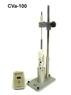 The Caulking Viscometer consists of a support stand and a disposable sample tube filled with the liquid whose viscosity is to be determined. Viscosity of the sample is determined by measuring the falling time of a controlled needle through a predetermined distance of the fluid held in a sample tube. The falling time is measured automatically by means of Hall sensors and a magnet in the weight holder (CV-100), laser sensors (CVa-100) or manually (CVm-100). For Non-Newtonian fluid, a computer program is available from SBS.