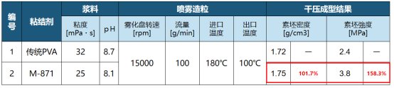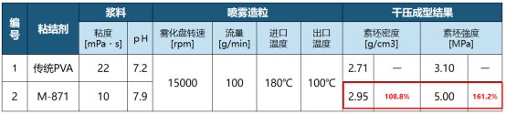M-871表现:素坯强度突破5.0 MPa(较传统PVA提升61.2%),密度提升至2.95 g/cm³,助力高精度陶瓷器件生产。
